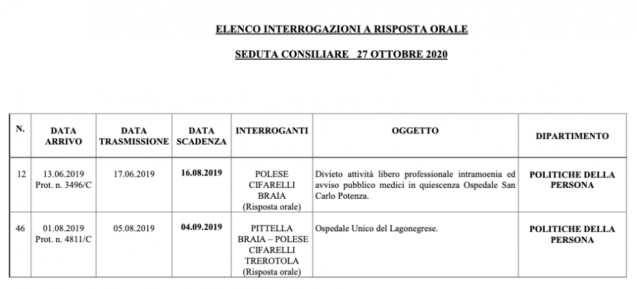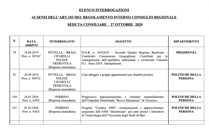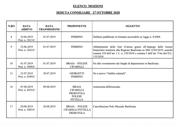 Il Consiglio regionale della Basilicata è convocato, in seduta ordinaria, alle ore 15.30 di martedì 27 ottobre 2020 nell’aula Dinardo al piano terra del Palazzo della Giunta regionale in Via Verrastro n. 4 – Potenza.