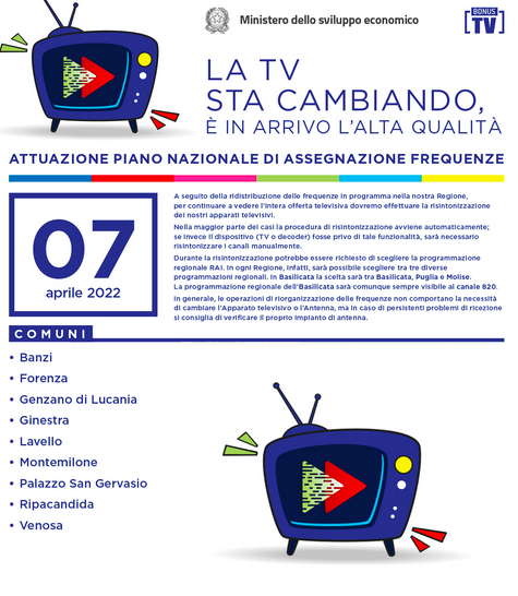 Banzi, Forenza, Genzano di Lucania, Ginestra, Lavello, Montemilone, Palazzo San Gervasio, Ripacandida e Venosa. Sono questi i primi comuni che saranno interessati domani, giovedì 7 aprile 2022, dalla prima delle nove giornate del processo di riorganizzazione delle frequenze TV in Basilicata.  Per continuare a vedere l’intera offerta televisiva i cittadini di questi comuni dovranno effettuare la risintonizzazione degli apparati televisivi. Nella maggior parte dei casi la procedura di avviene automaticamente; se invece il dispositivo (TV o decoder) fosse privo di tale funzionalità, sarà necessario risintonizzare i canali manualmente. Durante la risintonizzazione potrebbe essere richiesto di scegliere la programmazione regionale RAI.