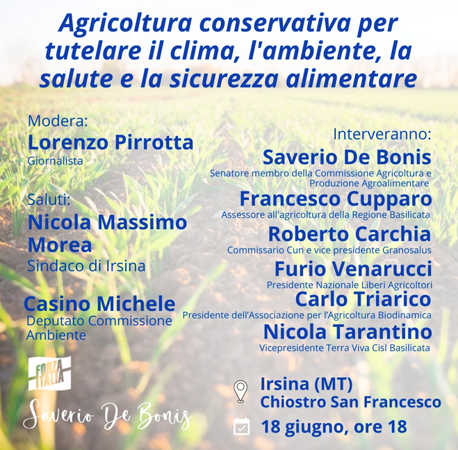 Così il senatore Saverio De Bonis annuncia l’evento che si svolgerà ad Irsina, presso il Chiostro di Sana Francesco, dal titolo ‘Agricoltura conservativa per tutelare il clima, l’ambiente, la salute e la sicurezza alimentare’ che avrà come relatori  Francesco Cupparo (Assessore all’Agricoltura della Regione Basilicata), Roberto Carchia (Commissario Cun e vicepresidente Grano Salus), Furio Venarucci (Presidente Liberi Agricoltori), Carlo Triarico (Presidente dell’Associazione per l’Agricoltura Biodinamica), Nicola Tarantino (Vicepresidente Terra Viva CISL Basilicata),  il sindaco Nicola Massimo Morea e l’On. Michele Casino. Modererà il giornalista Lorenzo Pirrotta.