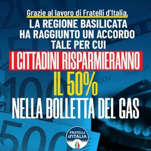 Sulla pagina social di Fratelli d’Italia c’è una card che inneggia all’accordo compensazioni che porterà uno sconto in bolletta del 50% per tutti i lucani. Si tratta di una misura decisa dal Presidente Bardi e sostenuta da tutto il centrodestra che inizia a fare notizia a livello nazionale e che costituirà un modello per il futuro della Basilicata e non solo.