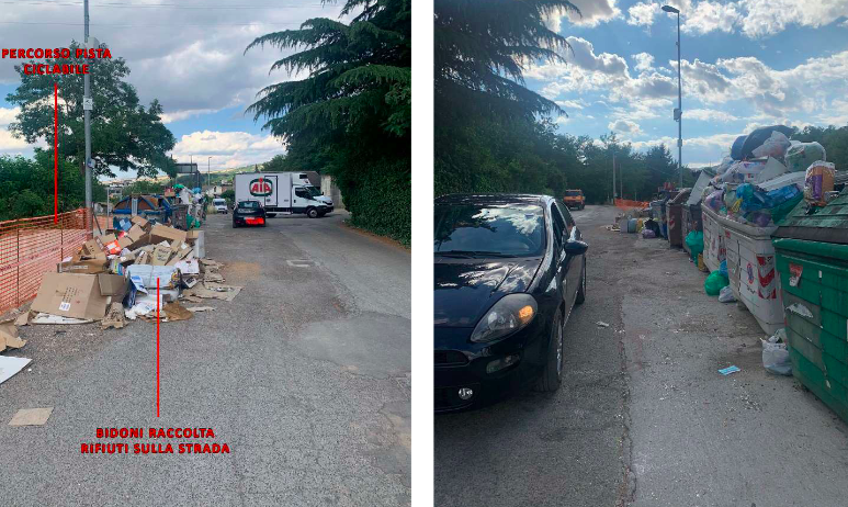 Come si evince dalle foto inviateci e che alleghiamo al presente, lungo il tracciato della pista vi è un’isola ospitante i cassonetti per la raccolta dei rifiuti solidi urbani.
