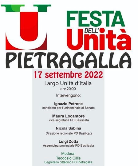 Ritorna a Pietragalla la Festa dell’Unità in versione pre elettorale per discutere dei temi cari alla sinistra democratica e progressista nella cornice di Largo Unità d’Italia.