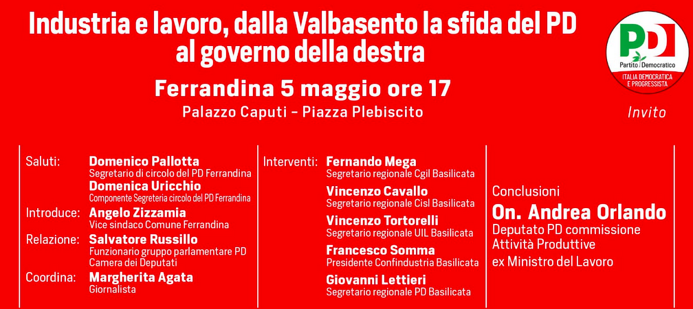 Venerdì 5 maggio, alle ore 17, a Ferrandina, si terrà un convegno su industria e lavoro in Valbasento, promosso dal locale circolo del PD. L’iniziativa ha come obiettivo quello di accendere i riflettori sulla prima storica area industriale della Basilicata, sulle sue prospettive sulle azioni di rilancio produttivo ed occupazionale. I processi di transizione energetica ed ecologica, le politiche attive, le infrastrutture, necessitano di un protagonismo dei territori. Il convegno vedrà la partecipazione delle organizzazioni sindacali, Cgil, Cisl e Uil, di Confindustria e le conclusioni saranno affidate all’ex ministro del lavoro e attuale componente della commissione attività produttive della camera, On. Andrea Orlando.