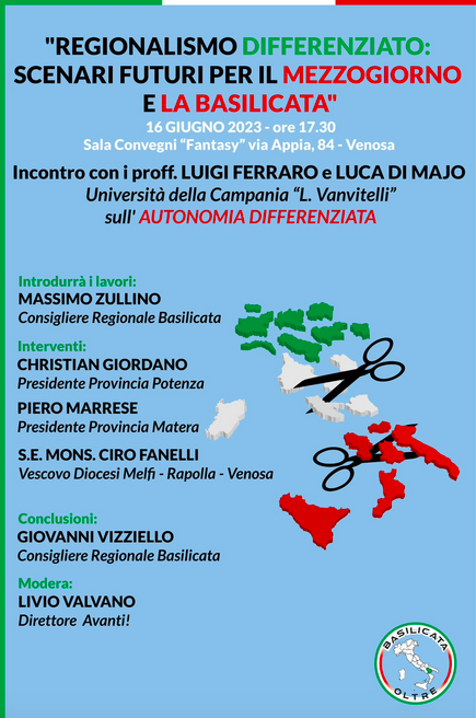 È in programma oggi oalle 17.30, presso la sala convegni “Fantasy” in Via Appia (Parco Oraziano) a Venosa, l’incontro organizzato dal gruppo consiliare di Basilicata Oltre e intitolato “Regionalismo differenziato: scenari futuri per il Mezzogiorno e la Basilicata”.