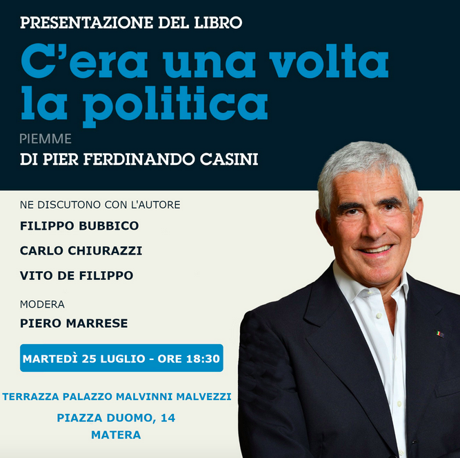 Nella splendida location della terrazza di Palazzo Malvinni Malvezzi, a Matera, martedì 25 luglio, alle 18.30, il sen. Pier Ferdinando Casini, già Presidente della Camera dei Deputati, presenterà il suo libro dal titolo “C’era una volta la Politica” con un moderatore d’eccezione: il Presidente della Provincia di Matera, Piero Marrese.