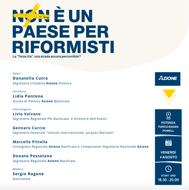 La “terza via” è una strada ancora percorribile? Su questo interrogativo si snoderà il dialogo a più voci sul Riformismo in Italia e in Basilicata, organizzato da Azione Basilicata. Il talk si terrà venerdì 4 agosto, presso il Parco Baden Powell di Potenza, dalle ore 18:30. Al dibattito interverranno: Donato Pessolano, segretario regionale di Azione Basilicata; Marcello Pittella, consigliere regionale e componente della segreteria nazionale di Azione; Livio Valvano, Segretario Regionale PSI Basilicata e Direttore dell’Avanti; Gennaro Curcio, Segretario Generale “Istituto Internazionale Jacques Maritain”. I lavori saranno introdotti dagli interventi di Donatella Cutro, segretaria cittadina di Azione Potenza, e Lidia Pantone, Scuola di Formazione Politica Azione Basilicata.
