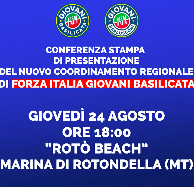 l coordinamento regionale di Forza Italia Giovani Basilicata è felice di comunicare alle agenzie di stampa e di informazione che, nella giornata di giovedì 24 agosto, alle ore 18:00 presso il “Rotò Beach” di Marina di Rotondella (MT), si terrà la conferenza stampa di presentazione del nuovo organigramma che il movimento giovanile del partito si è dato sul territorio nelle ultime settimane.