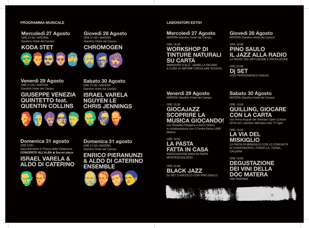 Dopo oltre 15 concerti in giro per i comuni della Basilicata, dopo un contest, dopo l’inaugurazione dell’Audioteca del Gezziamoci aperta a Palazzo San Gervasio, dal 27 al 31 agosto, a Matera, nel giardino dell’Hotel del Campo per tutta la giornata si svolgeranno laboratori estivi sulla pasta fatta in casa, sul Miskiglio, degustazioni di vini, musica per bambini, laboratori di Quilling, guide all’ascolto con il giornalista Pino Saulo, Dj set, e concerti la sera con i Koda Quintet, Chromogen, Giuseppe Venezia Quintetto feat. Quentin Collins e Israel Varela, Nguyen Le e Chris Jennings il 30 agosto. Sempre a Matera, il giorno dopo, il 31 agosto, il tradizionale concerto all’Alba in località segreta e, a chiusura della fase estiva del Gezziamoci, il concerto di Enrico Pieranunzi & Aldo Di Caterino Duo.
