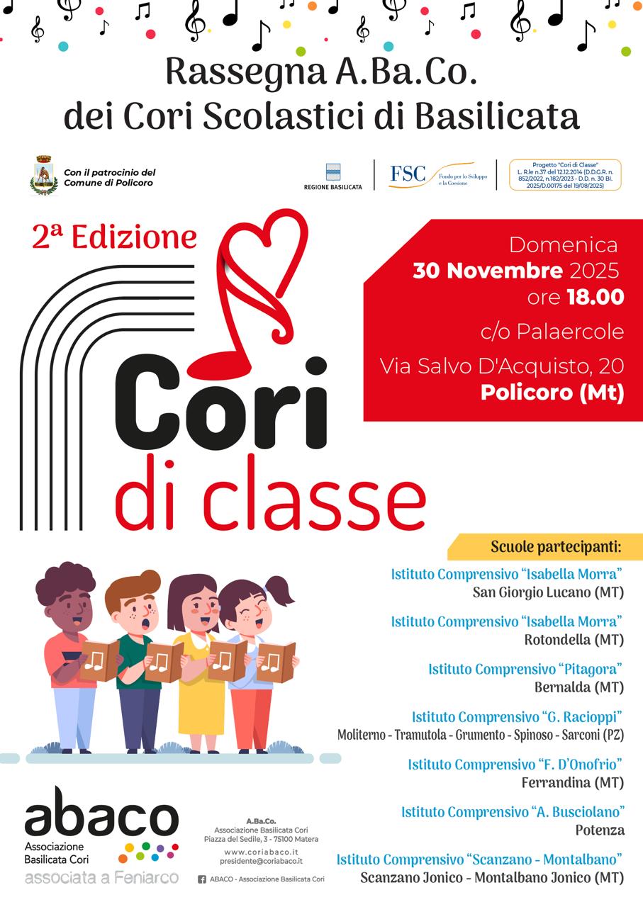 La rassegna è il culmine di un intenso percorso didattico e formativo promosso da A.Ba.Co., che mira a valorizzare il canto corale come strumento di aggregazione, espressione artistica e crescita personale all’interno del contesto scolastico. Il progetto “Cori di Classe” ha ottenuto il sostegno istituzionale, in quanto patrocinato dal Comune di Policoro e dalla Regione Basilicata con un altrettanto protocollo di intesa con USR di Basilicata.