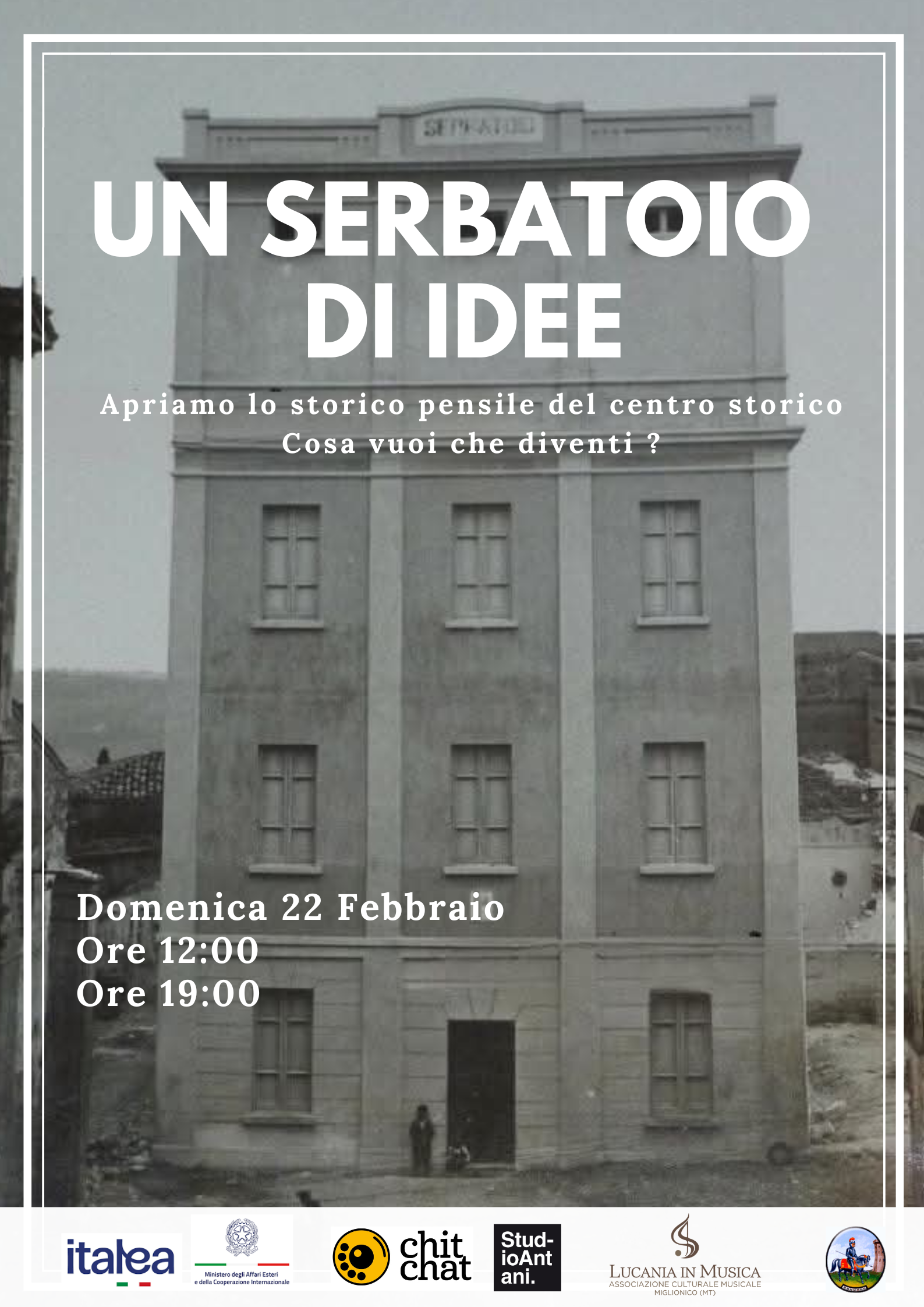Per l’occasione di Domenica 22 febbraio, l’amministrazione comunale, con l’ultima parte del progetto del Ministero degli esteri “Turismo delle radici” e grazie alla collaborazione con Acquedotto Lucano che detiene la concessione dell’immobile, aprirà il piano terra della struttura e con il ChitChat dello Studio Antani coinvolgerà la popolazione per immaginare la destinazione dello spazio. Il ChitChat Audio è un dispositivo interattivo – creato da Studio Antani – che permette di registrare e condividere messaggi vocali. È uno strumento innovativo di partecipazione diretta. “Siamo lieti di metterlo a disposizione di un progetto che punta a coinvolgere la comunità per raccogliere storie e memorie del vissuto personale ma anche opinioni, idee e proposte per il futuro del palazzo del Serbatoio.” Luca Acito – direttore creativo Studio Antani.