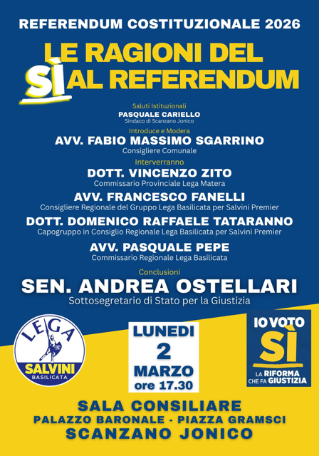 Si terrà il 2 marzo alle ore 17.30 nella sala consiliare del Palazzo Baronale di Scanzano Jonico, l’incontro pubblico dal titolo “Le ragioni del Sì al Referendum Costituzionale 2026”.